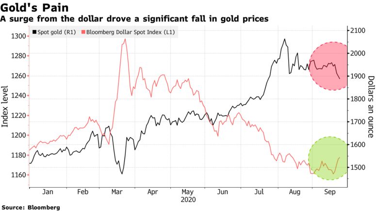 金价周四跌至逾两个月低点,受强劲的美元打压,投资人对于美国经济刺激政策的不确定性感到担忧。现货金下跌0.7%至每盎司1,851.51美元,连跌第四日。盘中稍早金价触及7月22日以来低点1,847.99美元。美国期金下跌0.8%至1,853.10美元。美元指数持坚于逾八周高点附近,因欧洲和美国的经济放缓迹象让围绕疫情破坏经济的担忧重燃。“金价摆脱不了美元强势的影响,这个影响波及到所有资产类别,”OANDA的资深市场分析师Edward Moya表示。