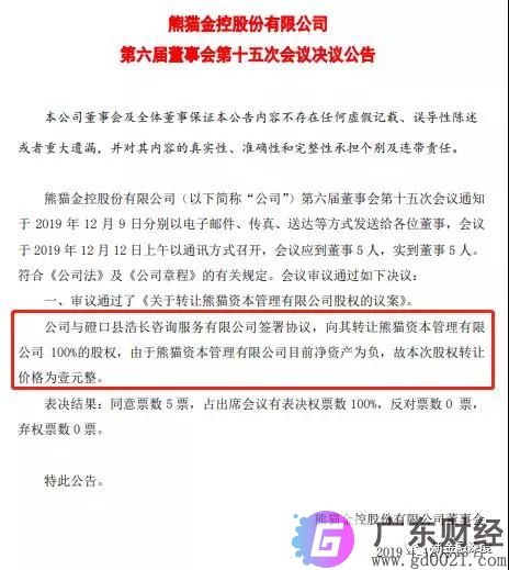 议案内容显示,公司与磴口县浩长咨询服务有限公司签署协议,向其转让熊猫资本管理有限公司100%的股权,由于熊猫资本管理有限公司目前净资产为负,故此次股权转让价格为1元整。