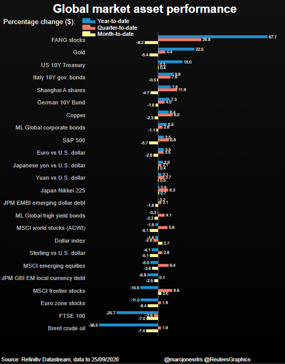 受惠于逾20万亿美元全球刺激计划和科技股的强劲上涨,MSCI明晟全球市场指数在7月和8月累计上涨14%,收复了2月时创下的历史高位。油价进一步上涨10%,投资者在8月持续撤出避险资产公债和黄金,视频应用程序Zoom ZM.O继续高歌猛进,即使是世界上最贫穷国家的债券市场也在飙升。 然后9月份来了!