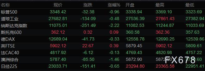 美股三大指数全线收跌,标普500指数收盘下跌32.40点,跌幅0.96%,报3348.44点;纳斯达克指数收盘下跌251.50点,跌幅2.22%,报11075.02点;道琼斯指数收盘下跌134.10点,跌幅0.48%,报27682.81点。