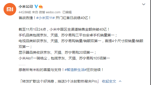 站长之家(ChinaZ.com)11月2日 消息:今天上午,小米公司发布双十一战报,宣布截至11月1日24点,小米中国区全渠道销售金额突破40亿,同时包揽了多项第一。
