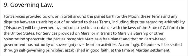 在Beta版测试第九条法律条款中,明确强调火星是自由星球,不受现有既定法律的约束,通过SpaceX提供服务,包括Starship移民、Starlink互联网的用户,将奉行以诚信为基础的自治原则。