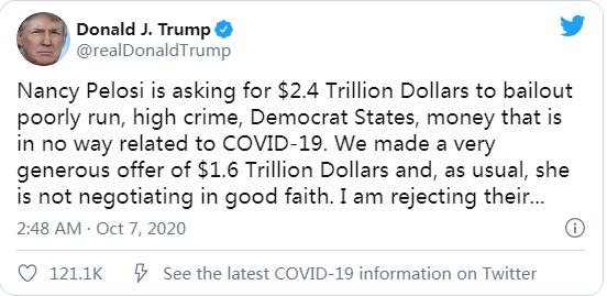 就目前而言,特朗普的推文似乎结束了佩洛西与姆努钦长期以来就新一轮冠状病毒援助方案达成协议的努力。