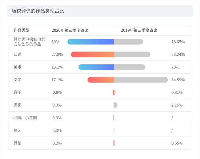 相反,文字类作品的版权登记数量相较去年有所减少。这主要是由于互联网内容生态正从图文向视频升级,大量图文创作者开始谋求转型。