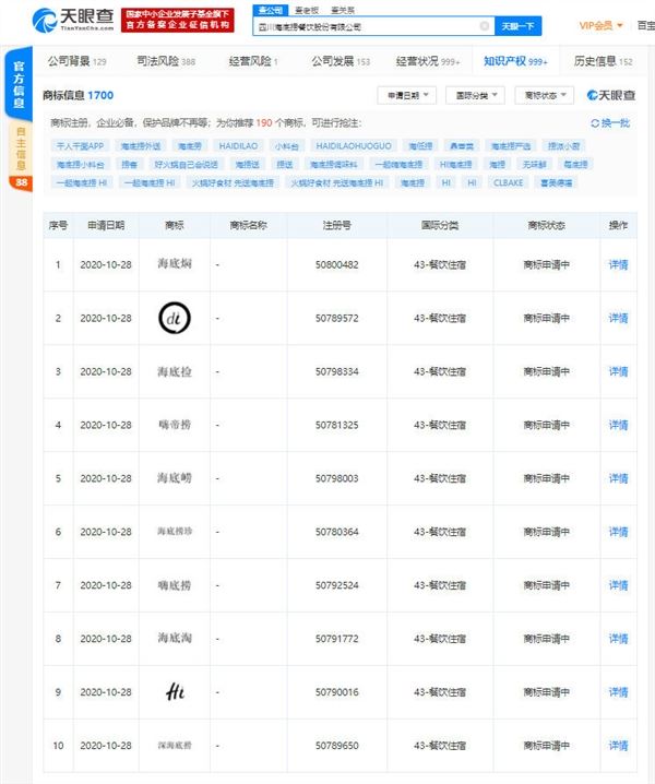 天眼查App显示,近日,四川海底捞餐饮股份有限公司新增多条商标信息,包括“池底捞”、“渠底捞”、“清底捞”、“上海底捞”、“深海底捞”、“海底捡”、“三每底手劳”等。