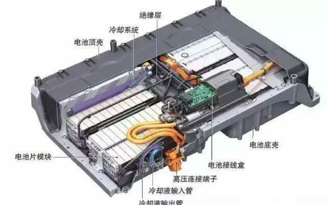 这是一个典型的动力电池系统的构成图。可以发现,电池片模块(也就是我们常说的电芯)只占其中的一部分,除此之外,还有各种杂七杂八的配件,比如冷却系统、绝缘层、接线盒、连接端子等等。