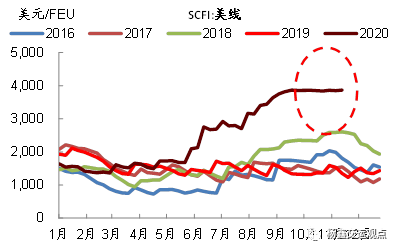 运价再度上涨的原因?需求强势增长下的供给(船舶、集装箱)紧张。从需求端来看,虽然海外公共卫生事件仍在蔓延但存在补库存和圣诞季需求(公共卫生事件期间欧美服务消费减少,商品消费增加),得益于国内良好的公共卫生事件防控效果和完整的产业链,中国出口获得全球份额,10月出口同比增长11.4%。从供给端看,目前船舶闲置运力已经回到历史低位(2%),短期内无额外运力可投放,且上海港欧线、美线船舶装载率维持在95%以上水平,因此供给端船舶处于紧平衡状态,加上进出口结构不平衡和前期的停航、欧美港口集装箱周转效率下降,出口地区缺箱使得实际舱位变得更加紧张,并且从高运价航线溢出到其他航线。北美航线自9月份即期运价创历史新高以来一直维持高位,11月6日美西线、欧线、澳新线、东南亚线(新加坡)SCFI即期运价分别周环比上涨0.6%、9%、6%、4%、87%(新加坡属于重要中转枢纽港,原本竞争激烈因而价格低、波动大)。
