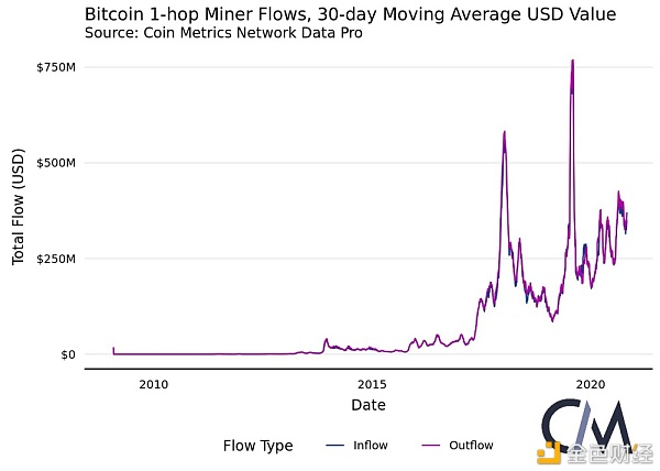为了分析比特币网络初期的资金流(当时矿池还没有成为主流挖矿模式),0-hop 地址资金流可能是更合适的工具。即使在今天,1-hop 地址资金流也只是矿工活动的近似值,因为矿池的钱包结构各不相同,并且这些资金流中可能错误地包含交易所地址。不过总的来说,这一研究模型代表了当今网络条件下对矿工支出更全面的观察。