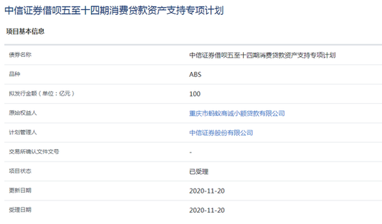 前述两个项目通过的日期显示为11月20日和11月23日,涉及的原始权益人分别是重庆市蚂蚁商诚小额贷款有限公司、重庆市蚂蚁小微小额贷款有限公司。重庆市蚂蚁商诚小额贷款有限公司注册资本40亿元,重庆市蚂蚁小微小额贷款有限公司注册资本为120亿,均为蚂蚁集团全资子公司。