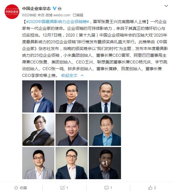 2020中国最具影响力企业领袖榜发布 雷军等上榜