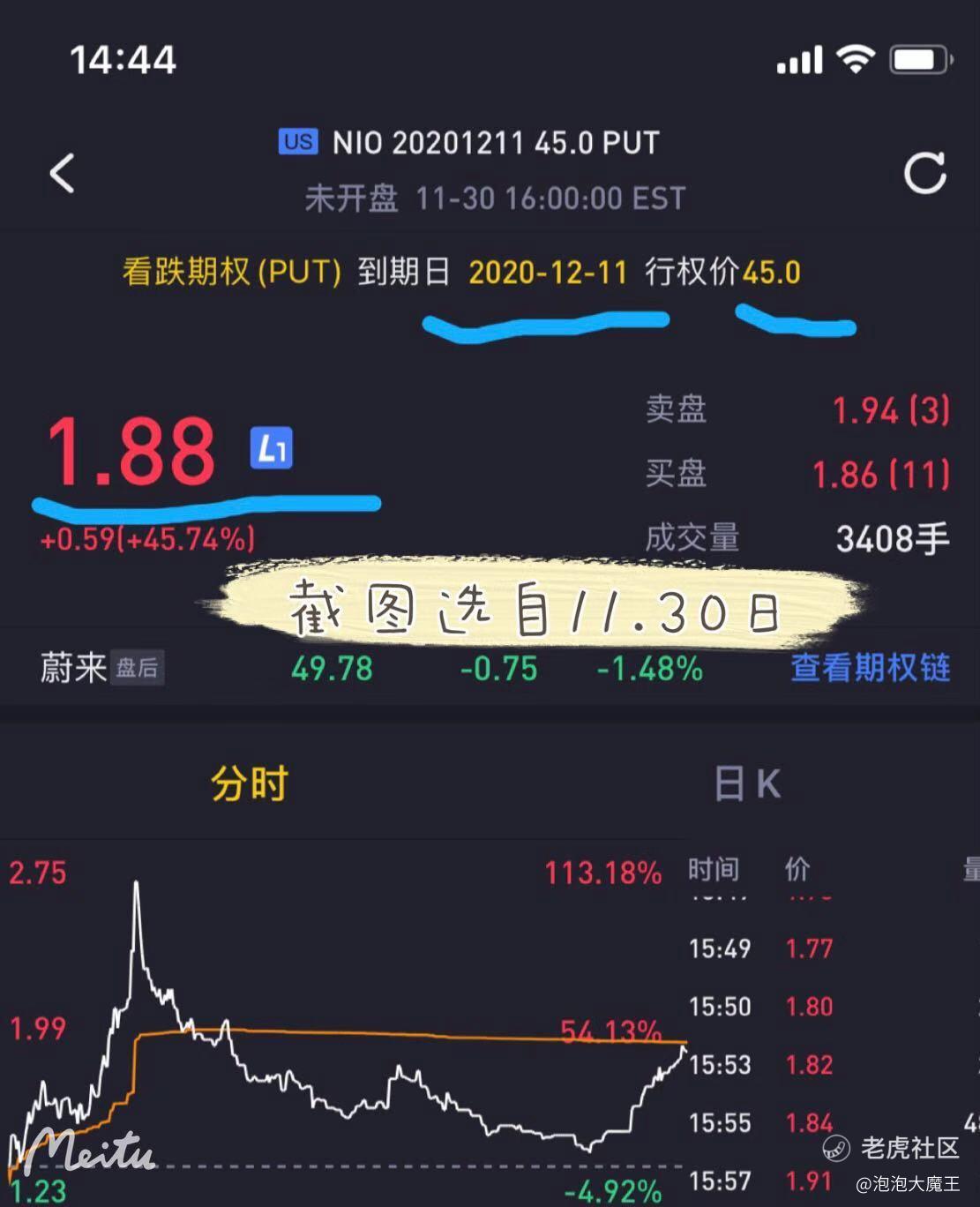 上图是一张nio的12.11日到期45美金的put。注意看画了蓝线的3个数字,一是行权日期12月11日,二是行权价格45,三是当前期权的权利金也就是价格1.88,暂时只需看这三个数字。