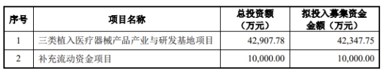 公司拟投入4.23亿元募集资金用于三类植入医疗器械产品产业与研发基地项目,1亿元用于补充流动资金。
