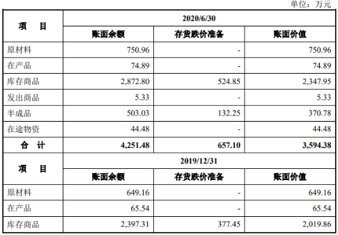 2017年至2020年上半年,康拓医疗的存货账面余额分别为2767.76万元、3050.73万元、3615.99万元、4251.48万元,占流动资产的比例分别为30.80%、28.21%、18.73%和20.28%,主要由库存商品、原材料、半成品构成。