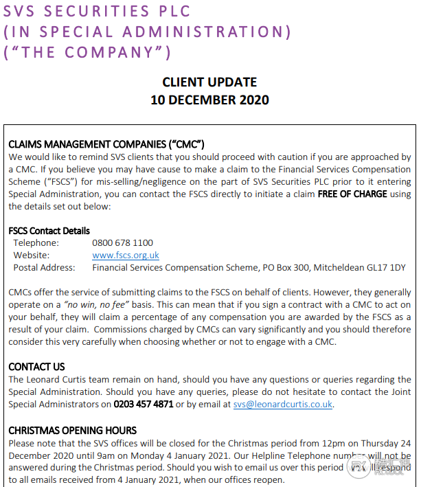 SVS Securities破产管理公司Leonard Curtis最近发布了客户更新,文件指出,如果有索赔管理公司(CMC)与SVS客户联系,客户应谨慎选择是否与其合作。