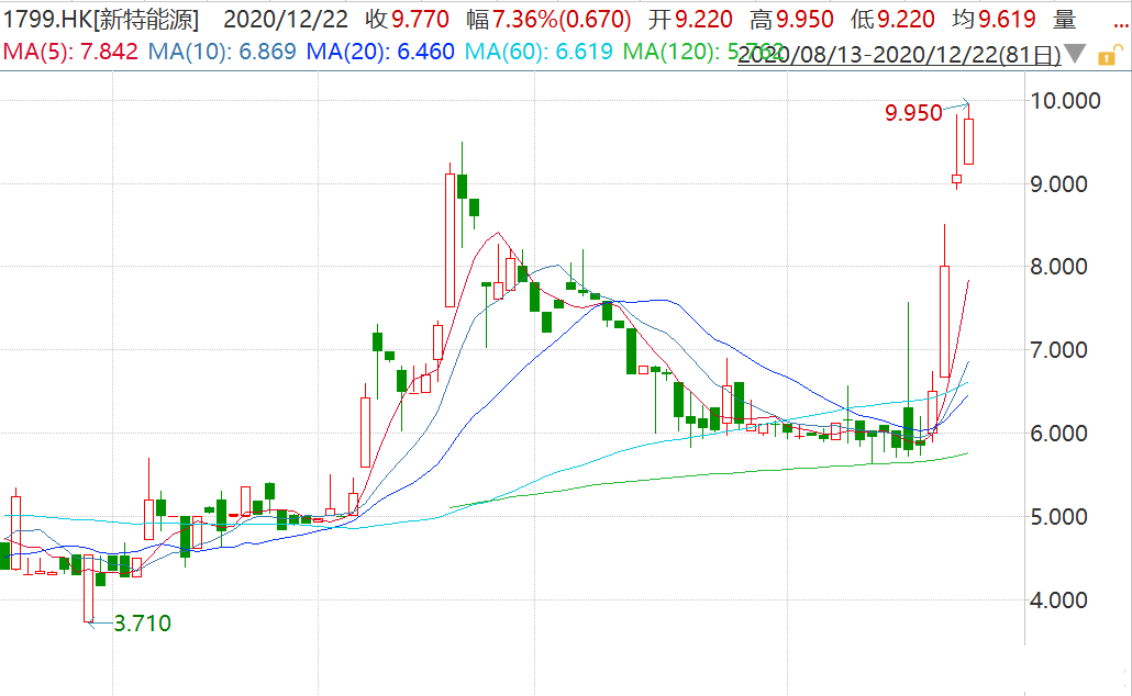 近日持续大涨的新特能源(1799)今日涨势继续,盘中一度拉升涨9.34%至9.95港元,领涨港股新能源股,股价创历史新高,市值一度达119亿港元。