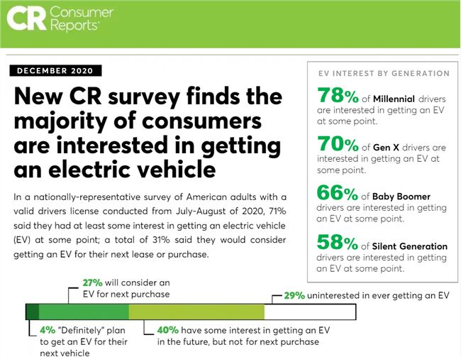 数据显示,71%的人表示他们至少在某些时候对购买电动汽车有一定的兴趣;共有31%的受访者表示,他们会在下次租赁或购买时考虑电动汽车。