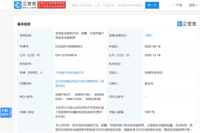 站长之家(ChinaZ.com)12月23日 消息:企查查APP显示,近日,小米数字科技有限公司公开了申请的区块链相关专利,专利名为“生成区块链的方法、装置、可读存储介质及区块链网络”,专利公开号为CN112102081A,专利摘要显示:本公开涉及一种生成区块链的方法、装置、可读存储介质及区块链网络,以提高区块链的容量。