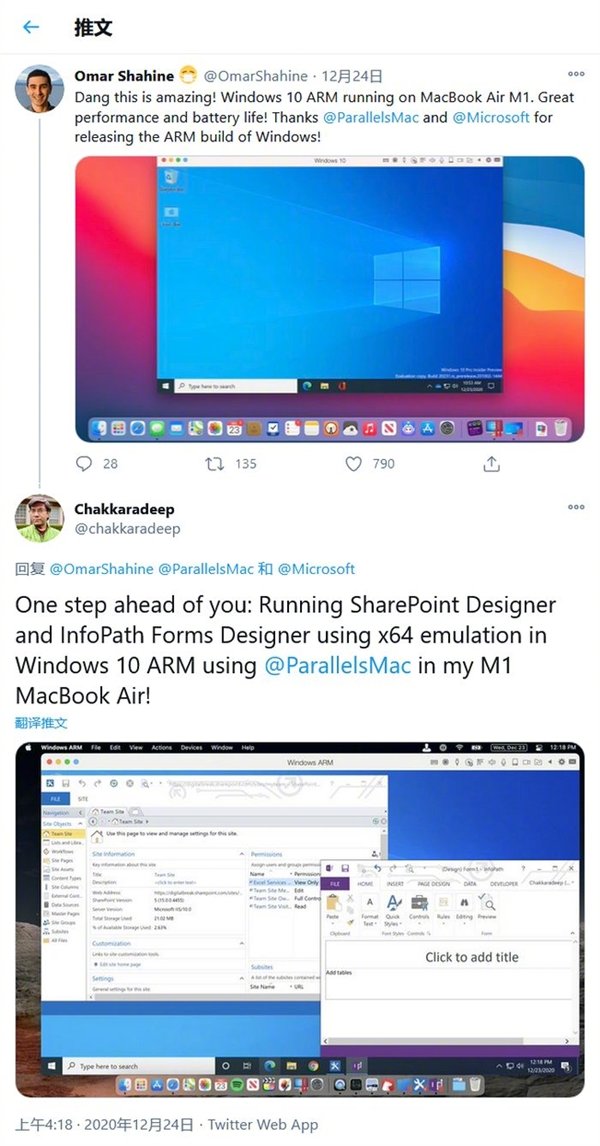 站长之家(ChinaZ.com)12月25日 消息:搭载M1处理器的Mac可以运行win10系统了!近日,微软高管Omar Shahine 近日在推特上发文盛赞,称适用于M1芯片的Parallels Desktop16最新技术预览版在电池寿命上表现出色。