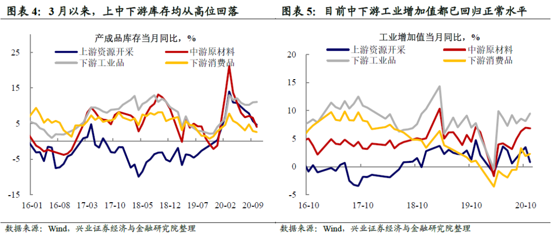 3月被动去库存之后,7月起中下游开始进入主动补库存阶段。2020年以来,库存周期经历了“被动补”-“被动去”-“主动补”阶段。随着需求的拉动和生产的改善,下游工业品和消费品从7月率先开始较为明显的补库存,中游原材料也在下游的高需求拉动下开始补库存。然而,中下游的需求还未有效传导到上游资源开采行业的库存累积,上游行业库存同比分位数仍然较低。