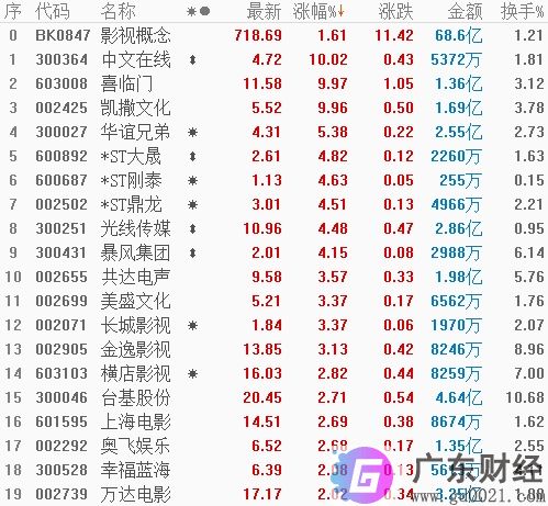 在交易的62家公司中52家公司上涨,占比84%。涨幅超过2%的公司19家,中文在线、喜临门、凯撒文化涨停,华谊兄弟涨超5%。