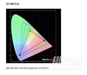 显示器色域测试结果是66%sRGB,49%Adobe RGB,49%P3色域,色准方面平均值还算凑合,但红色和蓝色的色样差距数值就有些无法直视了,要是作为设计或后期修图工具的话还是趁早打消这一念头吧。