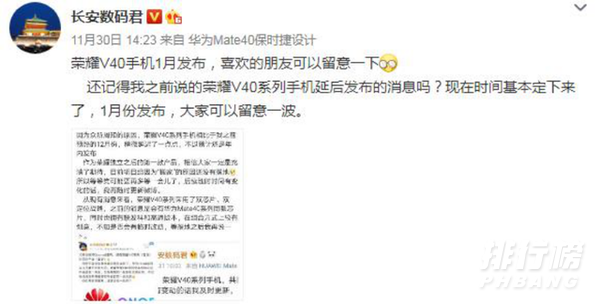 知名数码博主 @长安数码君 爆料称,荣耀V40系列的发布时间已经基本定下来了,在明年1月份发布。