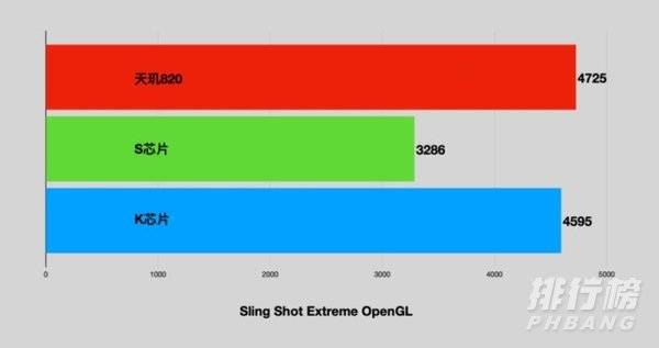 3DMark最高难度的基准测试Sling Shot Extreme场景,天玑820在OpenGL 3.1 API下比S芯片得分高43%以上,同时稍好于K芯片。即使在最新的Vulkan API下,天玑820得分4197,远超S芯片的3061分。