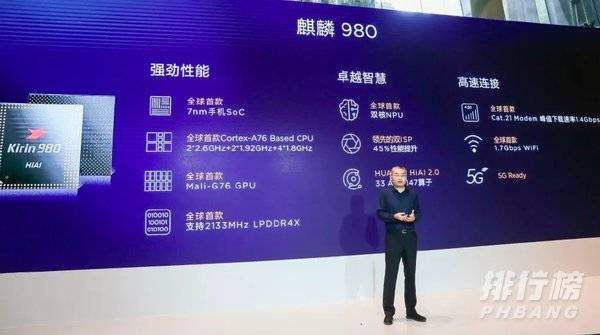 麒麟980是首款采用7nm工艺制造的商用SoC、也是首款采用ARM Cortex-A76以及Mali-G76架构的SoC,晶体管数量高达69亿,首发支持LPDDR4X-2133内存。