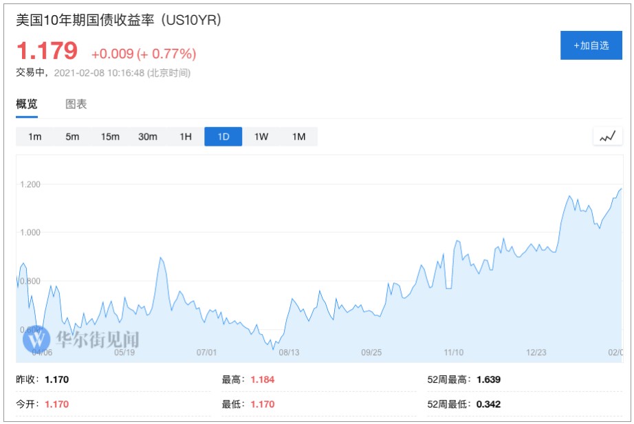 它是基于10年期美国国债与通胀保值债券收益率之差得出的衡量市场通胀预期的一项指标。基准10年期美债收益率近期也在持续上行,维持1%以上,目前报1.179%。