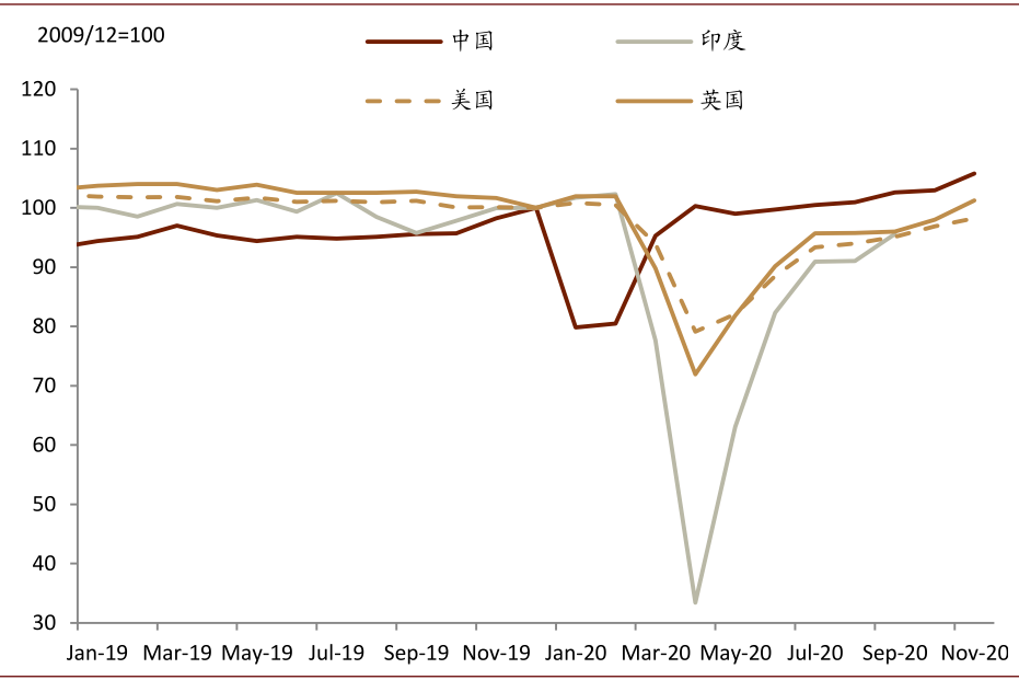 中金宏观组认为,在疫情冲击下,由于各国对疫情有效控制各有不同,全球各地区的工业活动复苏各有快慢。我们在2021年展望报告《供应上行有限,需求复苏可期》(2020.11.8)中预测今年大宗商品价格的相对表现排序为有色金属>石油>农产品>黑色金属>天然气>煤炭>黄金,而且基于各品种的供需特征,上半年有色金属领涨,后半年石油上涨更值期待。