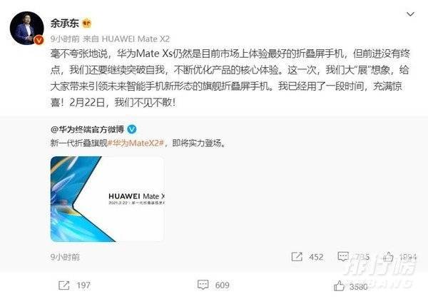 官宣之后,华为消费者业务CEO余承东也为华为MateX2发声。他认为,华为Mate Xs仍然是目前使用体验一流的折叠屏手机,但前进没有终点,我们还要继续突破自我,不断优化产品的核心体验。这一次,将会给大家带来引领未来智能手机新形态的旗舰折叠屏手机。从这段话其实至少可捕捉两个信息点,一是华为MateX2较之前有了明显的升级,二是采用了新的屏幕折叠形态。