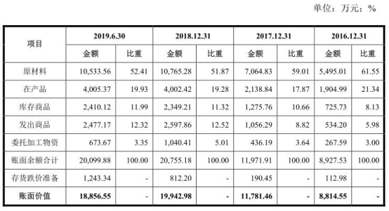 2016年末、2017年末、2018年末、2019年6月末,派克新材存货账面价值分别为8814.55万元、1.18亿元、1.99亿元、1.89亿元,占流动资产的比例分别为23.31%、25.13%、30.87%、22.76%。