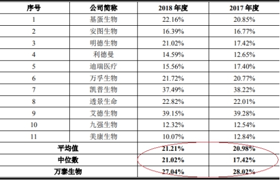 2013年至2018年,万泰生物毛利率分别为76.62%、76.18%、74.33%、72.73%、70.39%、72.62%、72.05%;2016年2018年行业均值分别为73.16%、71.54%、68.58%。