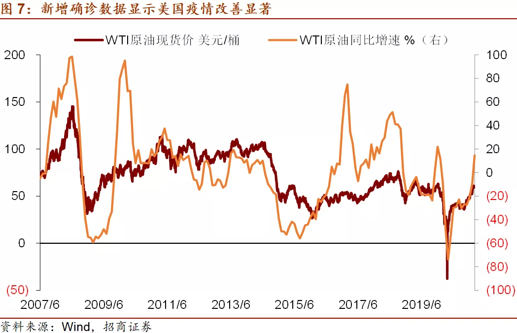 答:首先,由于美国的能源结构,油价上涨对于美国通胀预期上升具有很大影响。WTI原油现货价格从2020年10月末的35美元/桶一路上涨,近期油价站上60美元/桶,上涨了71%。而能源和食品决定美国通胀的短期波动,而核心通胀更能反映美国的基本面形势变化,并决定通胀的中枢水平。通过对历史数据的观察,我们发现整体CPI波动与能源CPI变化更加同步,而核心通胀决定了通胀的中枢水平。CPI能源分项的同比变化与BRENT原油和WTI原油现货价格同比变化高度相关(相关系数超过0.9),并滞后于其变化1个月。CPI食品分项的同比变化与CRB现货指数的食品分项相关,滞后期7-8个月。如果油价站稳当前水平,那么4月油价同比增长将达到259%,并对整体CPI产生极为显著的带动。根据我们的测算,预计今年美国通胀高点将出现在4、5月,在油价为40美元/桶的情况下,单月CPI可能冲高至4%,在油价为60美元/桶的情况下,单月CPI可能冲高至6-7%。