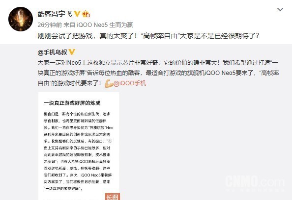 独立显示芯片助力 iQOO Neo5拥有“真正的游戏好屏”