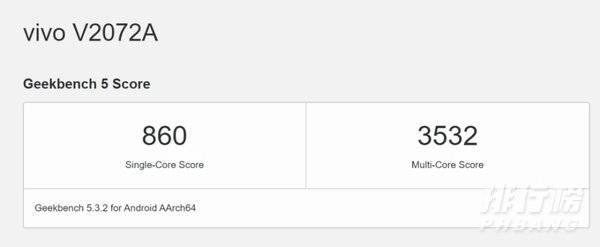 成绩列表显示,在Geekbench 5.3.2 for Android AArch64基准下,vivo S9的单核成绩为860分,多核成绩为3532分。其提供了12GB内存的支持,运行基于Android 11的操作系统。