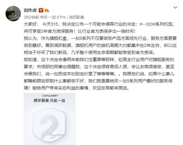 今年是一年一度的315,对于手机厂商而言,将产品做好是它们的核心工作,但在产品之外,质保服务也对消费者负责人的一种体现。在这个特殊的日子里,一加科技CEO、一加手机创始人刘作虎宣布了一个“可能会得罪行业的决定”:一加9系列机型,将可享受2年官方质保服务,比行业官方质保多出一倍时间。有网友评论:2年质保,手机厂商第一个,虎哥大手笔呀!