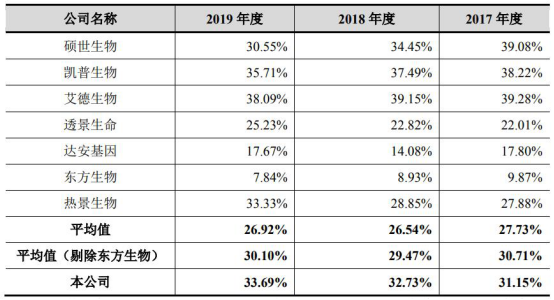 根据招股说明书,2017年至2019年,圣湘生物可比同业上市公司有7家,其中5家综合毛利率远高于圣湘生物,同期可比上市公司综合毛利率均值分别为72.06%、71.24%、71.64%,圣湘生物综合毛利率仍低于行业均值。