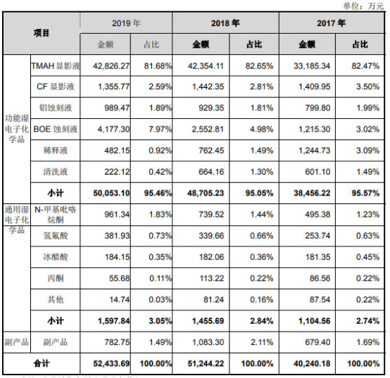 TMAH显影液系格林达的主营产品,各期该产品销售收入占其主营业收入的比例在81%以上。2017年-2019年,格林达TMAH显影液销售收入分别为3.32亿元、4.24亿元、4.28亿元,占同期主营业务收入的比例分别为82.47%、82.65%、81.68%。