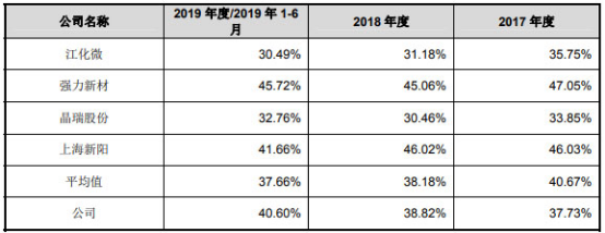 报告期内,格林达毛利率变动趋势与同行背道而驰,成为唯一一家毛利率上涨的公司,同行业上市公司相似业务毛利率2019年相比2017年均呈下滑趋势。2017年-2019年,格林达毛利率分别为37.73%、38.82%、40.60%。行业平均值分别为40.67%、38.18%、37.66%,其中江化微分别为35.75%、31.18%、30.49%;强力新材分别为47.05%、45.06%、45.72%;晶瑞股份分别为33.85%、30.46%、32.76%;上海新阳分别为46.03%、46.02%、41.66%。