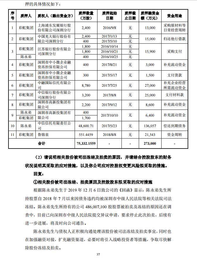 兆新股份回应关注函称,根据陈永弟先生于2019年12月6日致公司的《回函》显示:陈永弟先生所持股票自2018年7月以来因债务违约均被深圳市中级人民法院等相关法院司法冻结。陈永弟先生所持有的公司486,007,100股股票被拍卖及冻结的原因还在调查中,目前已向深圳市中级人民法院提交异议申请,要求停止此次拍卖,后续有进一步进展,将及时向公司通告。陈永弟先生与债权人正积极沟通处理该股份被司法冻结及拍卖事宜,同时也在加强融资对接,扩充融资渠道,必要时将引入战略投资者等措施,争取尽快解除股份冻结及拍卖。