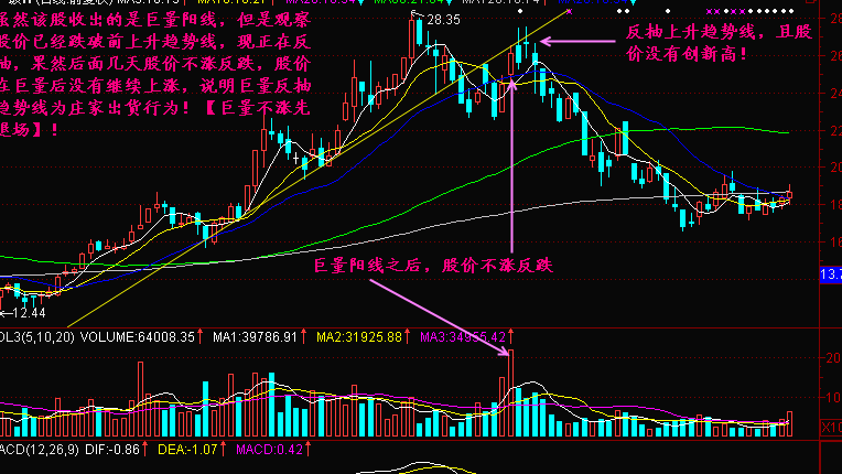 【巨量不涨先退场】是变被动为主动的做法,如果后期该股果然能再上涨,那我们再跟进还来得及,毕竟巨量处主力又加仓了,但如果不能再度股票上涨,却反转下跌,那我们就冷眼旁观即可,说明巨量处是主力在对倒诱多了。