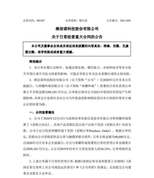 4月12日,维信诺公布了一份《关于日常经营重大合同的公告》,向公众透露,与荣耀终端有限公司签署的日常经营类订单累计不含税金额达8.91亿元,订单执行将对公司2021年度的经营状况产生积极影响。