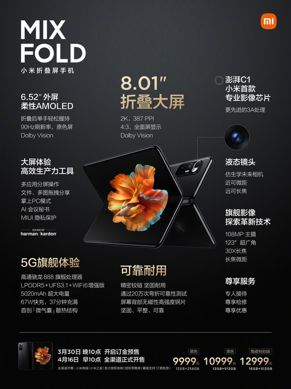 配置方面,小米MIX FOLD搭载骁龙888移动平台,支持LPDDR5+UFS3.1+WiFi6增强版,首创“微气囊”散热结构;内置5020mAh大电池,支持67W快充,37分钟充满;搭载小米首款专业影像芯片澎湃C1,后置三摄,包括1.08亿像素主摄、123°超广角镜头和30倍长焦镜头,其中长焦摄像头是全球首发液态镜头,采用仿生新技术,一颗镜头可以同时实现长焦和微距两种功能;配备超大振幅扬声器,harman / kardon联合调校,成就首款四扬声器立体声手机。