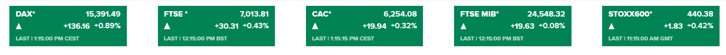 欧美股市:欧洲股市周五开盘走高,投资者对中国第一季度创纪录的经济增长表示欢迎。在伦敦,富时100指数开盘后上涨0.5%,自2020年2月以来首次突破7000点关口,而法国CAC指数上涨0.2%,德国DAX指数上涨0.3%。截至发稿,欧洲主要股指走势如图:
