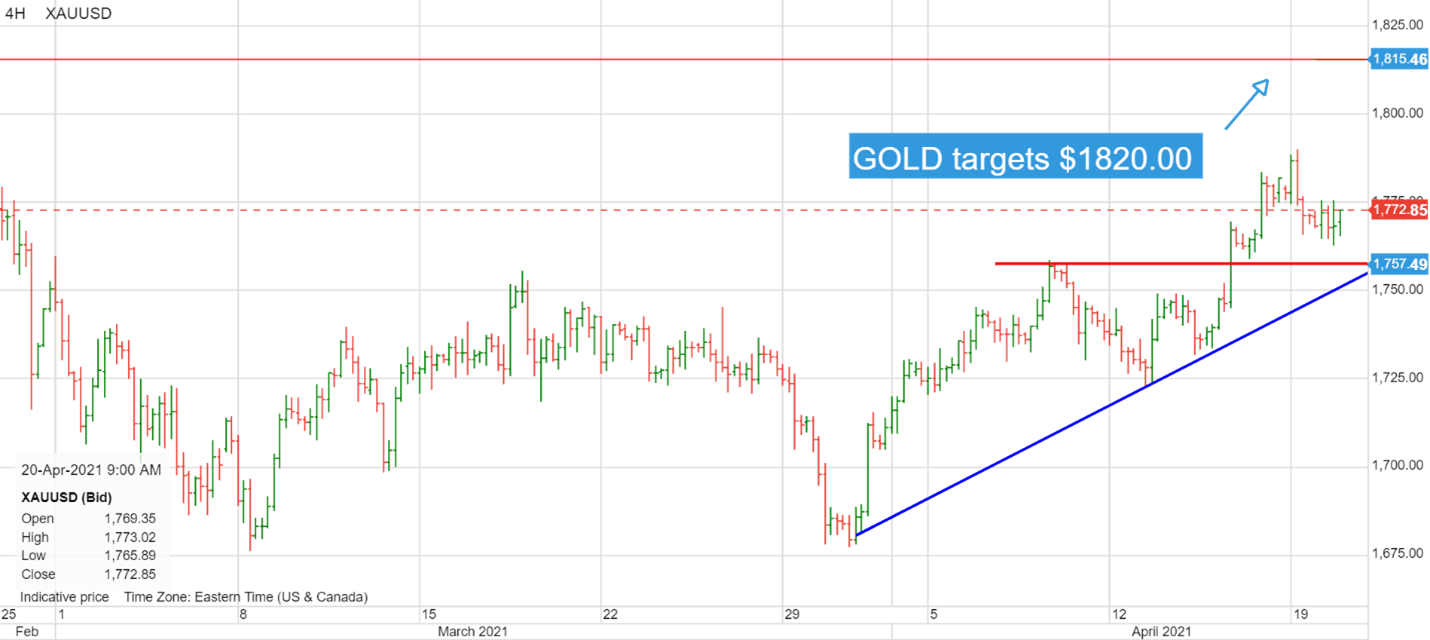 (黄金4小时走势图,来源:盛宝银行)