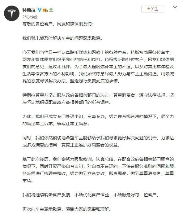 20日晚间,特斯拉通过官方微博就未能及时解决车主的问题,发布致歉信称,尊重并坚定服从政府各相关部门的决定,尊重消费者,遵守法律法规,坚决坚定地积极配合政府各相关部门的所有调查。特斯拉已成立专门处理小组,专事专办,努力在合规合法的情况下,尽全力的满足车主诉求,争取让车主满意。