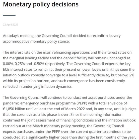 周四(4月22日),欧洲央行公布了最新的利率决议,欧洲央行主要再融资利率0%,预期0%,前值0%;欧洲央行存款便利利率-0.5%,预期-0.5%,前值-0.5%;欧洲央行边际贷款利率0.25%,预期0.25%,前值0.25%。