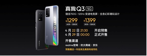 真我Q3 6GB+128GB版本售价1299元,8GB+128GB版本售价1399元。4月22日21:30起正式开启预售,4月29日0点,在realme官网,欢太商城,京东等平台正式开售。