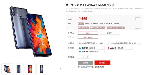 一张图看懂moto g50新品 高通骁龙480售价1499元